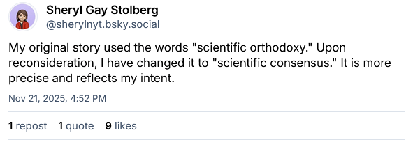 I absolutely detest this, but The Atlantic is far from the only mainstream outlet polluting journalism like this. The New York Times also found a way to present RFK Jr’s changes to the CDC’s vaccine safety website last week as if they were in some way balanced with the science of vaccine safety. Amazingly, the author of the piece updated the language in one spot, but still failed to correct the issue. It’s originally read: