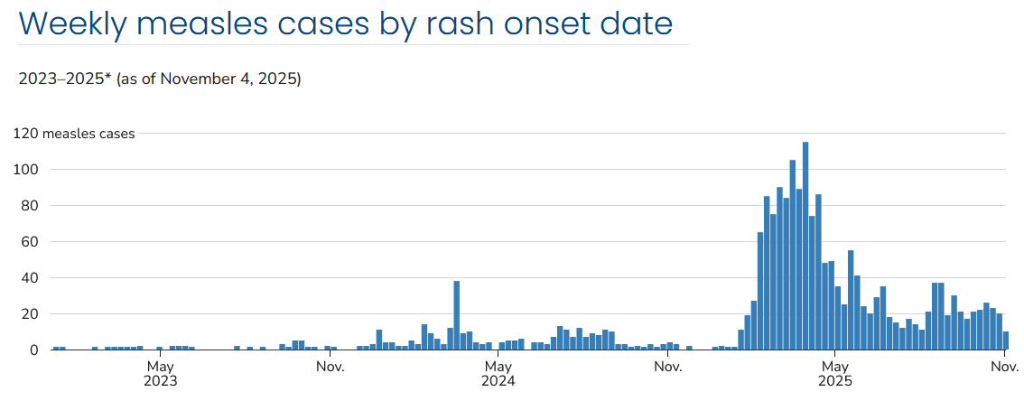 New cases of measles seem to be holding steady, according to the latest CDC update on Wednesday. Measles isn’t a seasonal virus, but gatherings around the holidays this year could give it a chance to spread further. Travel may be limited as we get closer to the holidays as the government shutdown is now leading to cancelled flights. The measles outlook is currently uncertain, but if you’re worried, you should talk with your healthcare provider about getting an MMR booster. You may not even need one, but your healthcare provider can help you determine if you do or don’t.
